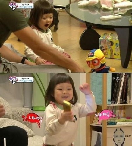 이후 추사랑은 자신을 붙잡아 두려는 김동현의 장난에 한참 시달린 후 뽀로로 인형을 직접 손에 얻게 되자 셔플댄스를 추는 듯 기쁨의 춤사위를 보여줘 웃음을 자아냈다.