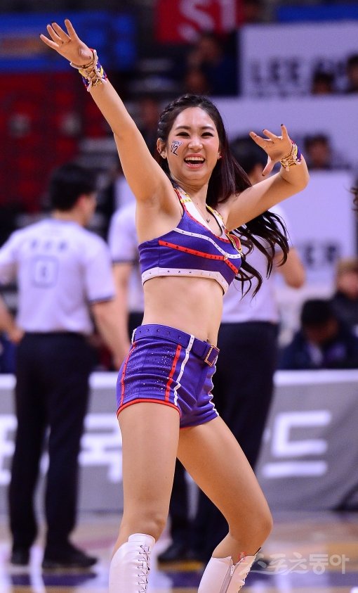 19일 고양체육관에서 열린 ‘2013-2014 KB국민카드 프로농구’ 6강 플레이오프 4차전 고양오리온스 대 서울SK 경기에서 치어리더가 흥겨운 춤을 추며 응원을 하고 있다.