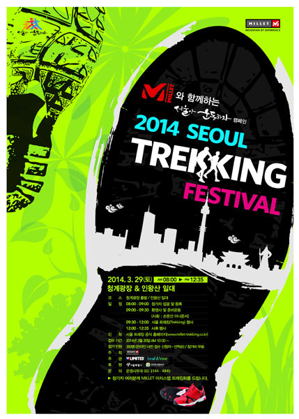 프랑스 아웃도어 브랜드 밀레는 서울시와 함께 ‘2014 서울 트레킹 페스티벌(사진)’을 개최한다. 오는 29일 인왕산을 걷는 약 3시간짜리 코스다. 트레킹 페스티벌 마이크로 사이트(millet-trekking.co.kr)를 통해 접수하면 참가할 수 있다.