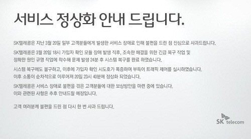 이에 SK텔레콤은 공식홈페이지를 통해 “지난 20일 일부 고객분들에게 발생한 서비스 장애로 인해 불편을 드린 점 진심으로 사과드린다”는 글을 전했다.