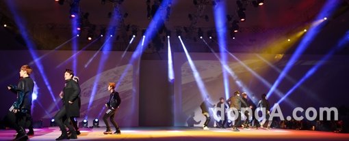 그룹 엑소가 21일 오후 서울 중구 동대문디자인플라자에서 '2014 춘계 서울패션위크(2014 F/W Seoul Fashion Week)' 오프닝 세레모니에서 화려한 무대를 선보이고 있다.