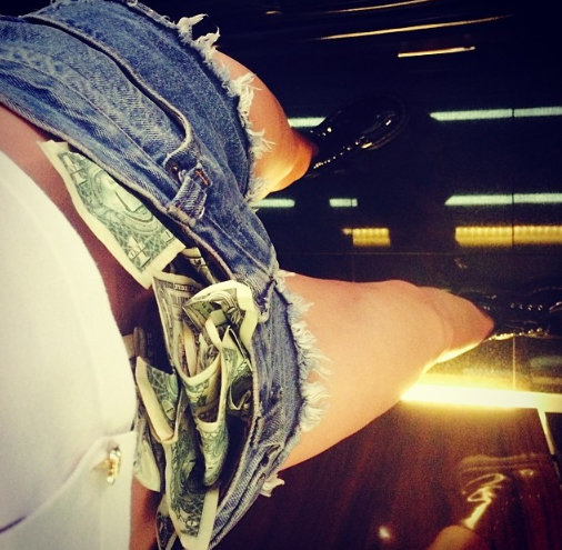 사진에는 핫팬츠 속에 지폐를 가득 넣은 모습이 담겨 있다. 촬영 의도는 알 수 없지만 묘한 각도로 찍혀 기괴한 느낌을 자아낸다.