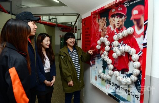 한화 팬들이 19일 대전구장 복도에 마련된 레전드 장종훈의 기념물 앞에서 환하게 웃고 있다. 대전|김민성 기자 marineboy@donga.com 트위터 @bluemarine007