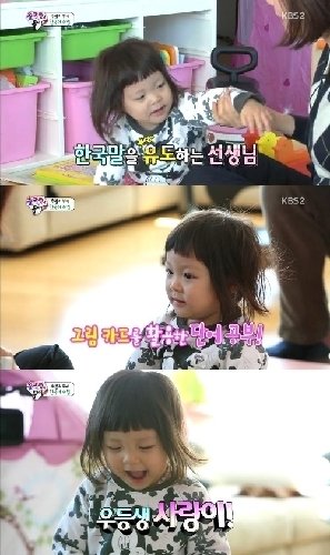 또, 선생님이 동요 ‘곰 세 마리’를 부르자 추사랑은 “사랑이 곰은 날씬해”라고 개사까지해 시청자들의 웃음을 자아냈다.