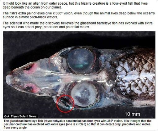 영국 일간지 데일리메일은 지난 24일(현지시각) “독일 튀빙겐 대학 연구진은 뉴질랜드 태즈먼 해 인근 심해 1000m 지역에서 4개의 눈을 지닌 괴물고기를 발견했다”고 보도해 화제로 떠올랐다.