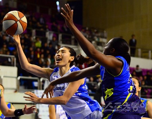 우리은행 임영희(왼쪽)가 25일 춘천 호반체육관에서 열린 ‘우리은행 2013∼2014 여자프로농구’ 신한은행과의 챔피언결정 1차전에서 신한은행 쉐키나 스트릭렌의 반칙에도 불구하고 끝까지 슛을 시도하고 있다. 춘천|박화용 기자 inphoto@donfa.com 트위터 @seven7sola