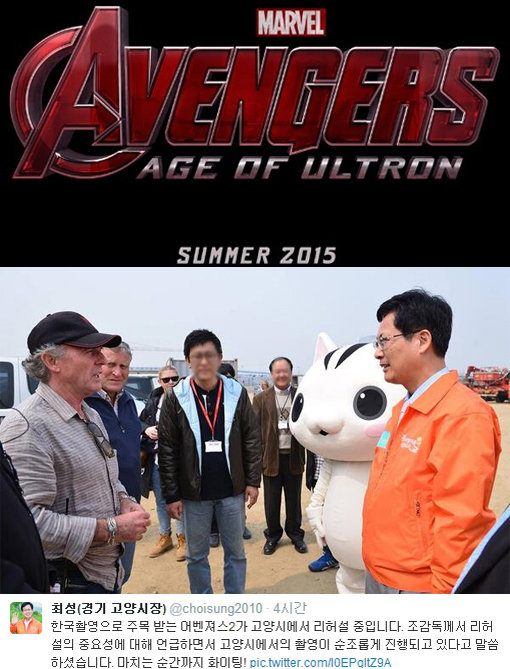 최성 고양시장은 27일 오후 자신의 트위터 계정 통해 “한국 촬영으로 주목 받는 ‘어벤져스2’가 고양시에서 리허설 중입니다”라고 적었다.