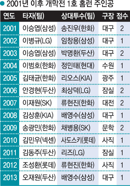 2000년대 이후에는 개막 1호 홈런의 주인공은 대구구장에서 주로 탄생했다. 2001년과 2003년 삼성 이승엽, 2002년 LG 이병규(9), 2008년 KIA 김상훈, 2013년 두산 오재원이 영광의 주인공이 됐다. <표참조>