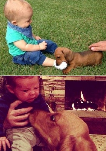 사진 속 대부분의 아기들은 개를 보고 신기해하면서도 해맑게 웃고 있다. 하지만 자신보다 큰 덩치의 개를 보고 화들짝 놀란 아기의 모습도 담겼다.