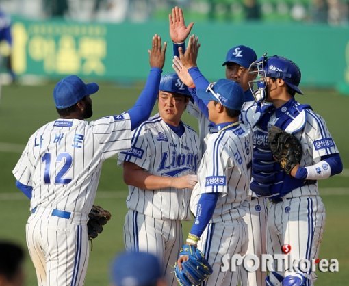 삼성이 KIA와의 경기에서 전날의 패배를 설욕했다. 삼성은 30일 대구 시민구장에서 열린 2014 프로야구 KIA와의 대결에서 나바로가 홈런과 3루타로 4타점을 뽑아내는 맹활약으로 8-5로 승리를 거뒀다. 경기를 승리로 마친 삼성선수들이 마운드 주변에서 하이파이브를 나누고 있다.
