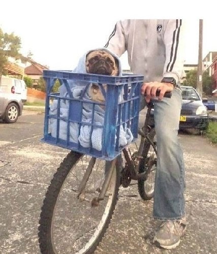 공개된 사진에는 한 남성이 자전거를 타고 있는 모습이 보인다. 이 자전거 앞에 달린 바구니에는 강아지 한 마리가 타고 있다.