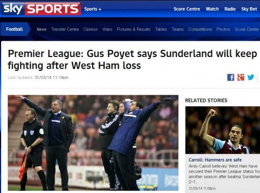 선덜랜드는 1일(이하 한국시각) 홈 구장인 영국 선덜랜드 스타디움 오브 라이트에서 열린 2013-14 잉글랜드 프리미어리그(EPL) 32라운드 웨스트햄과의 경기에서 1-2로 패했다.