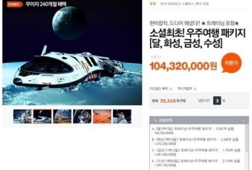 티몬의 ‘우주여행’에는 ‘6박 7일 달 여행’을 비롯해 ‘9박 10일 화성 여행’ ‘11박 12일 금성 여행’ ‘19박 20일 수성 여행’이 패키지 상품으로 담겨 있다.