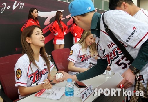 1일 광주에서 열린 ‘2014프로야구’ KIA 타이거즈와 NC 다이노스의 광주-KIA챔피언스필드의 개막전에 앞서 장외행사로 열린 선수단사인회에서 걸그룹 `스피카` 양지원이 사인회를 갖고 있다.