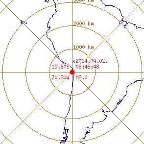 USGS에 따르면 이번 칠레 지진의 진앙지는 칠레 북부 타라파카주(州)의 주도인 이키케에서 서북서 방향으로 86㎞ 떨어진 바닷가다.