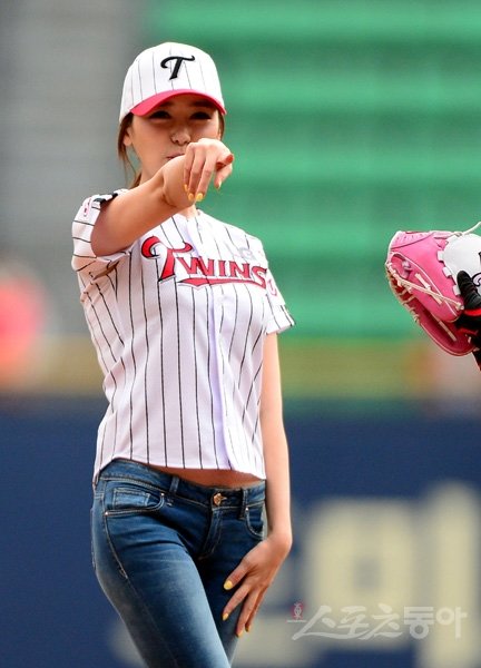 3일 서울 잠실야구장에서 ‘2014 한국야쿠르트 세븐 프로야구’ LG 트윈스와 SK 와이번스의 경기가 열렸다. 방송인 공서영이 LG 승리기원 시구를 던지기 전 포수를 향해 포즈를 취하고 있다.