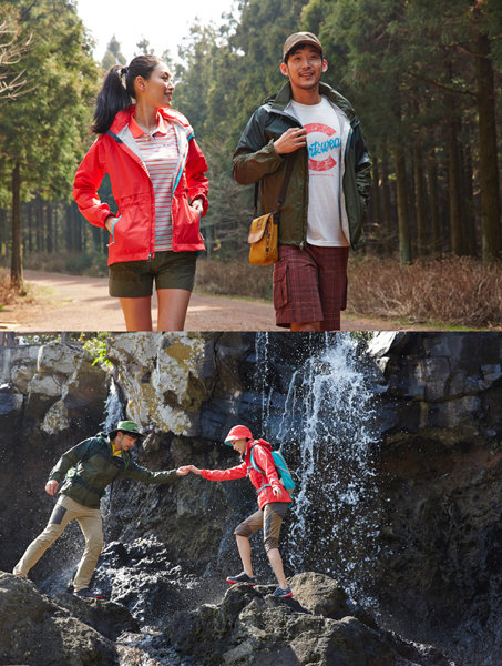 강렬한 원색과 디자인으로 정통 아웃도어 활동에 어울리는 커플룩을 선보이는 브랜드도 있다. 북유럽 아웃도어를 지향하는 ‘노스케이프’는 오렌지 톤의 남녀 방수 재킷을 봄 아웃도어 커플룩으로 선보였다. 디자인은 다르지만 오렌지 컬러를 잘 매치시키면 훌륭한 커플룩으로 변신한다. 슬림한 핏과 강렬한 이미지의 배색으로 세련된 아웃도어룩을 완성할 수 있는 것이 특징이다. 남성용 ‘더미작스 방수재킷’(49만9000원), 여성용 ‘얼티매테크 프로실드 방수재킷’(59만9000원)이 나와 있다.