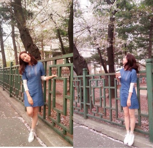 또 김민정은 벚꽃을 배경으로 원피스 진에 단화를 매치해 소녀 감성을 물씬 풍기고 있다.