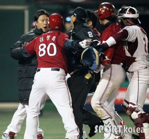 두 선수가 말을 주고 받는 사이 넥센 벤치에 있던 송신영이 김주찬을 향해 갑자기 뛰어 나왔다. 팀의 최고참 투수 송신영은 김주찬에게 화를 낼 정도는 아니었다는 의미로 항의 했다. 이택근이 급하게 달려와 송신영을 달래며 싸움이 커지는 것을 막았다.