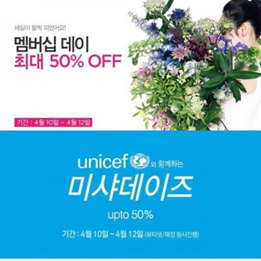 미샤는 공식 홈페이지를 통해 “10일부터 12일까지 총 3일간 홈페이지(뷰티넷)와 매장에서 ‘유니세프와 함께하는 미샤 데이즈’ 세일을 실시한다”고 공지했다.