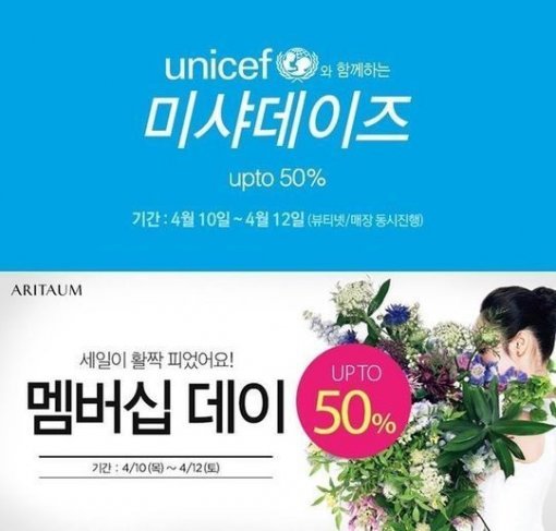 화장품 브랜드 미샤(MISSHA)와 아리따움(ARITAUM)이 동시에 할인행사를 진행한다.