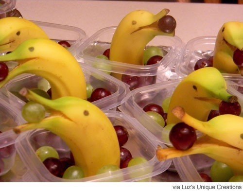 이 주부가 자신의 SNS에 공개한 사진을 보면 바나나의 긴 꼭지를 반으로 갈라 그 사이에 포도알을 끼워 돌고래를 표현한 아이디어가 눈에 띈다.