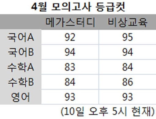 현재 한 교육업체가 제공하는 4월 모의고사 각 영역의 1등급 등급컷은 국어 A형 95점, 국어 B형 94점, 수학 A형 84점, 수학 B형 86점, 영어 93점 등으로 알려졌다.