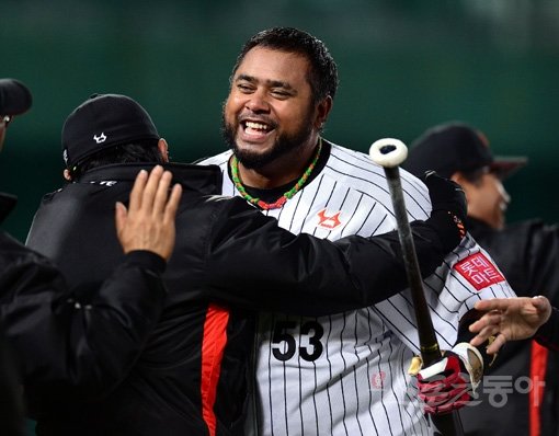 10일 부산 사직야구장에서 열린 2014 한국야쿠르트 세븐 프로야구 롯데자이언츠 대 LG트윈스 경기 연장 10회말 1사 1,2루 롯데 히메네스가 끝내기 홈런을 날린 후 홈인해 환호하고 있다.