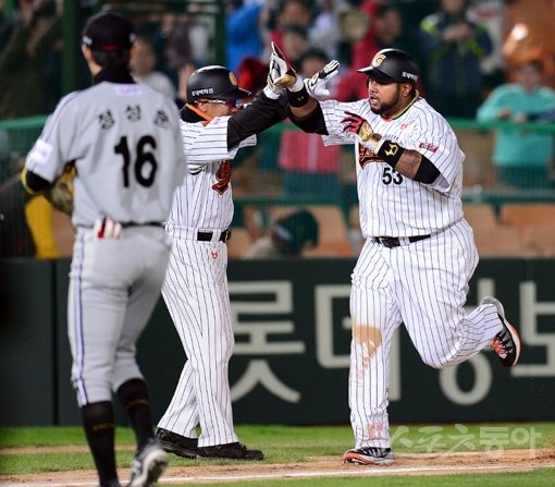 10일 부산 사직야구장에서 열린 2014 한국야쿠르트 세븐 프로야구 롯데자이언츠 대 LG트윈스 경기 연장 10회말 1사 1,2루 롯데 히메네스가 끝내기 홈런을 날린 후 그라운드를 돌며 환호하고 있다.