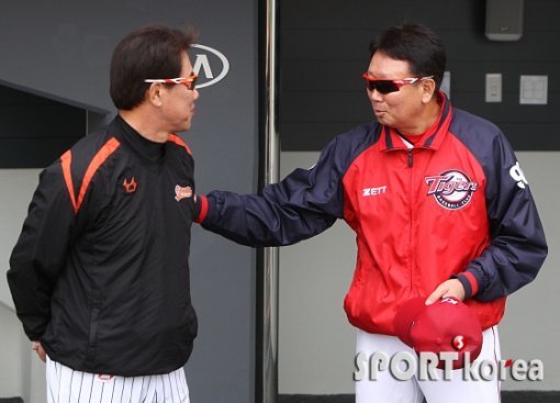 11일 오후 광주KIA챔피언스필드에서 열린 ‘2014 한국야쿠르트 세븐 프로야구’ KIA 타이거즈와 롯데 자이언츠의 경기에 앞서 롯데 김시진 감독, KIA 선동열 감독이 인사를 나누고 있다.