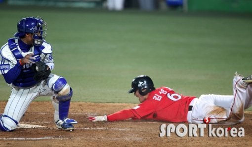 11일 오후 대구 시민구장에서 열린 ‘2014프로야구’ 삼성 라이온즈와 SK 와이번스의 경기 SK 9회초 무사 1,3루에서 2번 조동화의 우익수 희생플라이 때 3루주자 김성현이 홈으로 파고들어 삼성 포수 이흥련의 태그에 앞서 세이프 되고 있다.