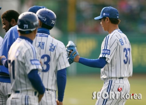 13일 오후 대구 시민구장에서 열린 ‘2014프로야구’ 삼성 라이온즈와 SK 와이번스의 경기에서 삼성 임창용이 7년만에 국내무대에 섰다. 8회초 2사 1,2루에서 SK 9번 김성현을 6구째 헛스윙 삼진으로 잡고 덕아웃으로 들어가고 있다.