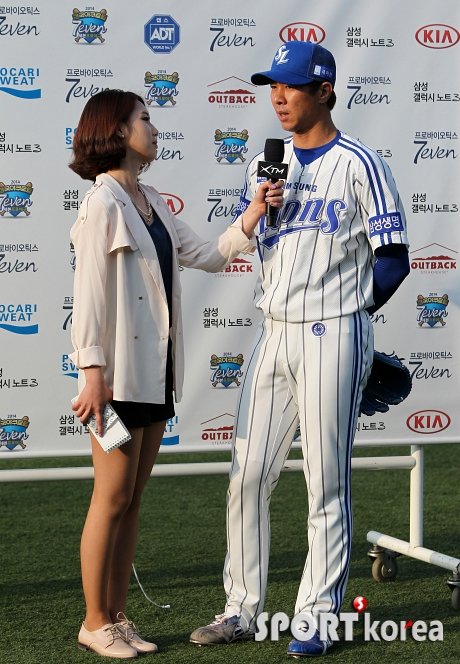 임창용의 7년만의 복귀무대는 극적인 드라마였다. 삼성 임창용은 13일 오후 대구 시민구장에서 열린 ‘2014프로야구’ SK와의 경기에서 동점인 8회초 1사 만루 때 등판 비자책점인 1점을 허용했으나 8회말에 타자가 2득점을 뽑아내 1.2이닝을 깔끔하게 처리하며 결국 승리투수가 됐다. 임창용은 5명의 타자를 상대로 24개의 볼을 던져 삼진2개와 범타 3개를 기록했다. 승리투수가 되며 국내무대에 화려하게 복귀한 삼성 임창용이 방송과 인터뷰를 하고 있다.
