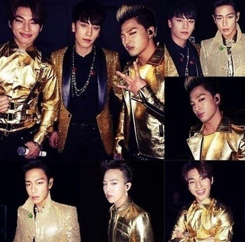 빅뱅이 오랜만에 한자리에 모인 이유는 일본 오사카 쿄세라돔에서 진행된 '2014 YG 패밀리 콘서트' 때문이다. 이날 빅뱅 멤버들은 번쩍번쩍 빛나는 금색 의상을 입고 카리스마 또는 장난기 있는 모습으로 완전체 인증샷을 뽐냈다.