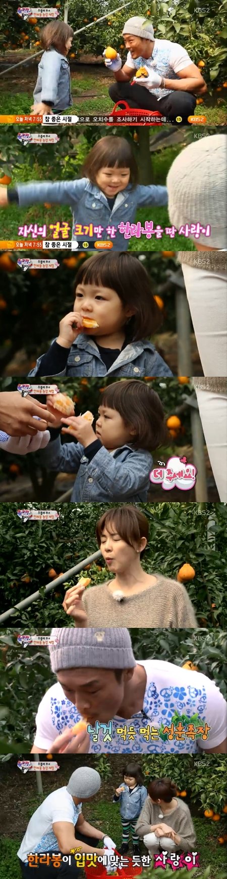 추사랑은 13일 방송된 KBS 2TV ‘해피선데이-슈퍼맨이 돌아왔다’에서 제주도 한라봉 농장에 방문해 한라봉 먹방을 선보였다.