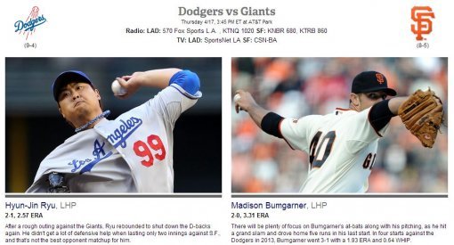 지구 라이벌과의 경기인데다 비슷한 나이의 왼손 투수 범가너와의 맞대결. 또한 류현진은 샌프란시스코에게 갚아야 할 빚이 있기 때문에 더욱 주목받을 것으로 보인다.