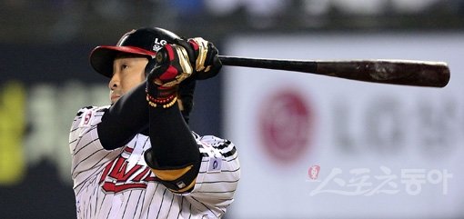 15일 서울 잠실야구장에서 열린 2014 한국야쿠르트 세븐 프로야구 LG트윈스 대 넥센히어로즈 경기 4회말 1사 LG 정의윤이 좌월 솔로 홈런을 날리고 있다.