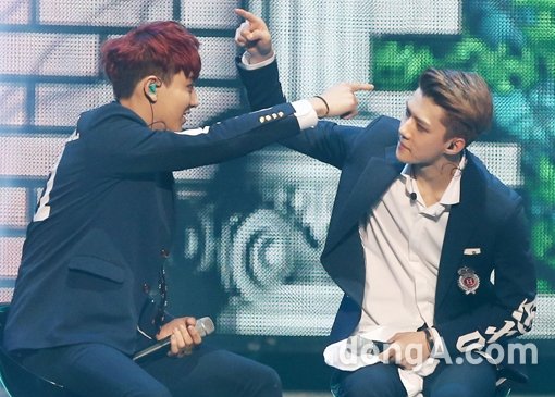 엑소의 세훈이 15일 오후 서울 잠실 실내체육관에서 열린 삼성 뮤직과 함께 하는 EXO 컴백쇼에서 장난을 치고 있다.