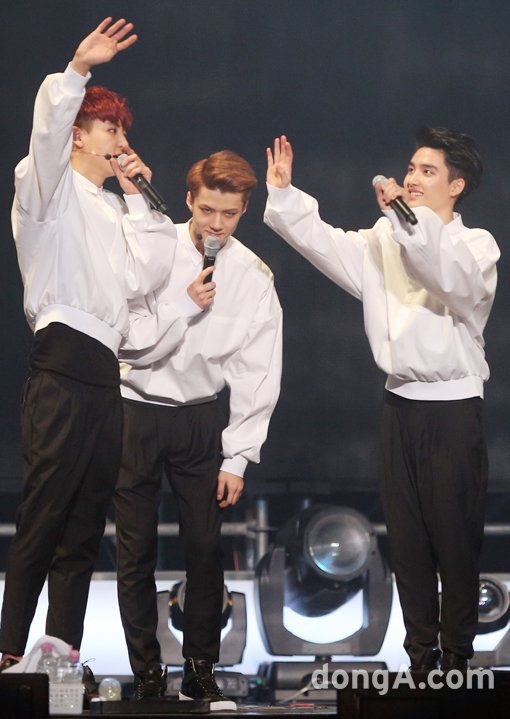 엑소가 15일 오후 서울 잠실 실내체육관에서 열린 삼성 뮤직과 함께 하는 EXO 컴백쇼에서 팬들을 향해 인사를 하고 있다.