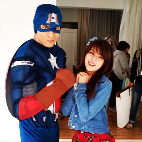 배우 줄리엔 강이 캡틴 아메리카로 변신해 일본 배우 후지이 미나와 인증샷을 찍었다.