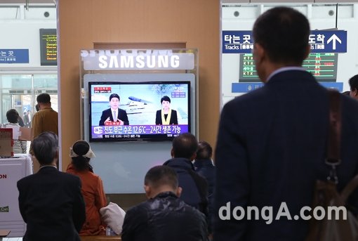 시민들이 16일 오후 서울역에서 수학여행에 나선 학생 등 476명의 승객을 태운 여객선 세월호 침몰 관련 뉴스를 시청하고 있다.