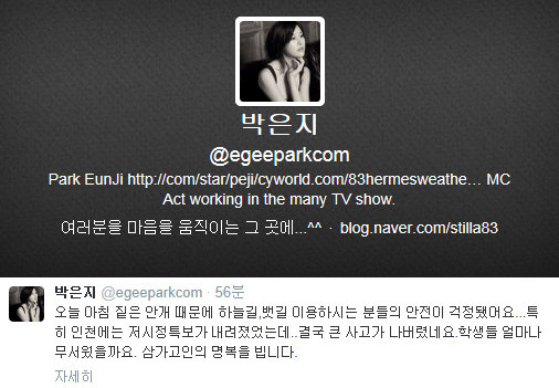 박은지는 16일 자신의 트위터에 “오늘 아침 짙은 안개 때문에 하늘길, 뱃길 이용하는 분들의 안전이 걱정됐어요…특히 인천에는 저시정특보가 내려졌었는데 결국 큰 사고가 나버렸네요. 학생들 얼마나 무서웠을까요. 삼가고인의 명복을 빕니다”라는 내용의 글을 올렸다.