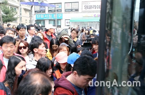 안산단원고등학교 학생들의 학부모들이 16일 오후 경기도 안산구 안산단원고등학교에서 세월호 침몰사고 후 구조된 학생들을 만나기 위해 버스에 탑승하고 있다.