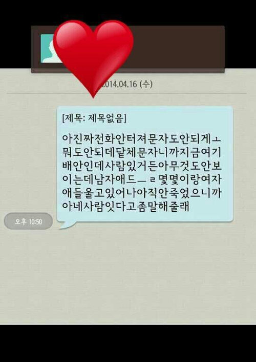 이 메시지에는 "아 진짜 전화안터져 문자도 안돼 지금 여기 배안인데 사람 있거든 아무것도 안보이는데 남자애들 몇몇이랑 여자애들 울고있어 나아직 안죽었으니까 사람있다고 좀말해줄래"라고 적혀 있다.
