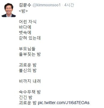 김문수 지사는 지난 17일 자신의 트위터 계정에 ‘밤’, ‘진도의 눈물’, ‘가족’, ‘캄캄바다’, ‘현장행’이란 제목의 자작시를 올렸다.