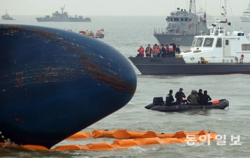 사고현장 둘러보는 실종자 가족들. 16일 오전 8시58분께 전남 진도군 조도면 병풍도 북쪽 20km 해상에서 인천에서 제주로 향하다 사고로 475여명이 탑승한 6천825t급 여객선 세월호가 침몰했다. 17일 오전 해경과 군당국이 헬기와 경비정, 특수요원 등을 동원해 수색하고 있는 가운데 실종자 가족들이 사고해역을 둘러보고 있다. 홍진환기자 jean@donga.com