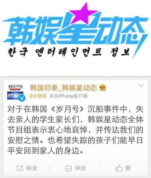 ‘한위싱동타이’의 제작진은 20일 웨이보 계정을 통해 “세월호 침몰 사고의 유가족 여러분께 깊은 애도의 뜻을 표한다”며 “소중한 가족을 잃은 분들의 참담한 심경에 위로를 전한다. 실종자들이 하루빨리 구조돼 가족의 품으로 돌아오기를 간절히 바란다”고 전했다.
