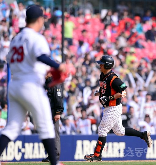 20일 서울 잠실야구장에서 열린 2014 한국야쿠르트 세븐 프로야구 두산베어스 대 롯데자이언츠 경기에 7회초 1사 롯데 강민호가 두산 유희관을 상대로 좌월 솔로 홈런을 날리고 그라운드를 돌며 하이파이브 하고 있다. 잠실|김종원기자 won@donga.com 트위터@beanjjun