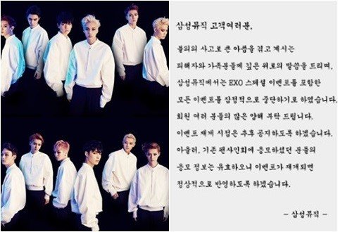 삼성뮤직 측은 “삼성뮤직 고객 여러분. 불의의 사고로 큰 아픔을 겪고 계시는 피해자와 가족 분들께 깊은 위로의 말씀을 드리며, 삼성뮤직에서는 엑소 스페셜 이벤트를 포함한 모든 이벤트를 잠정적으로 중단하기로 했습니다. 회원 여러분의 많은 양해 부탁드립니다”라고 밝혔다.