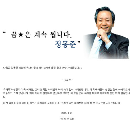 정몽준 의원은 “유가족과 실종자 가족 여러분, 국민 여러분께 깊이 머리숙여 사과드립니다. 제 막내아들의 철없는 행동에 아버지로서 죄송스럽기 그지 없습니다. 아이도 반성하고 있지만 모든 것은 저의 불찰입니다”라고 전했다.
